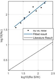 Figure 8. Relationship between Nu and Re in logarithm condition.