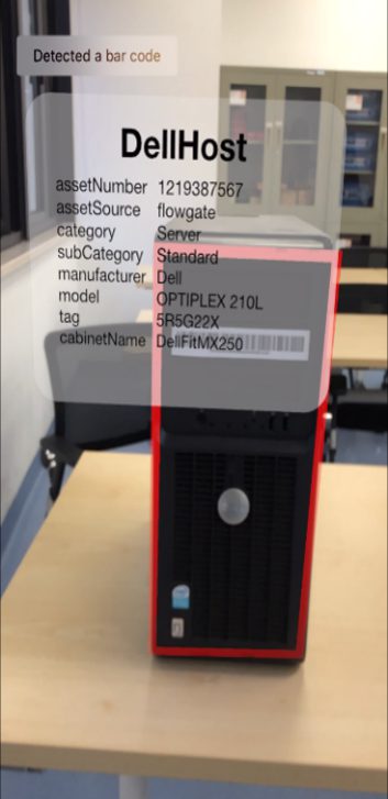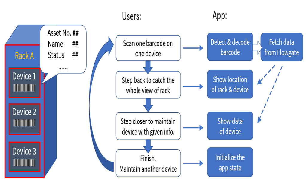 The detailed flowchart of the design is shown in Fig 3. When a user wants to maintain a device in Fig 3, he scans the barcode, and our device starts to detect and decode the barcode. Then the app will use the decoded information to fetch data from Flowgate. Next, the user steps back, to catch the whole view of the rack A. Our app then recognizes the rack and devices, and marks them by those red blocks in AR interface. The location information is provided in data from Flowgate. Then the user steps closer. Our app can show the detailed information of the device, and then the user can start maintaining the device with those information. After the user finishes, he can choose to maintain another device by starting a new session. Our app will be refreshed, and the user can scan another barcode now.