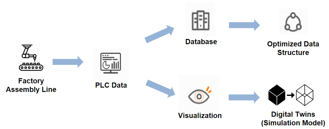 The modeling is mostly related to visualization part. We established a virtual 1:1 assembly line model (i.e. digital twin) as the original assembly line. After that, we connect real-time data collected from the assembly line to the digital twin. Based on the data collected, the digital twin can simulate the working condition of the original assembly line. Our model is well-synchronized with the original model and the simulation is precise.