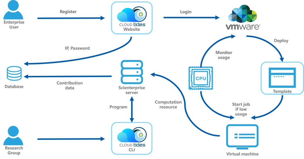The improvement of Project Tides is divided into three parts. The Website allows enterprise users to log in and manage their donated resources. The Template we made can help prepare the environment of the virtual machine (VM) that can be directly used by the research groups. The command line interface enables the research group to upload and run their programs within a few taps on the keyboard. They can also download the results through our command line interface.