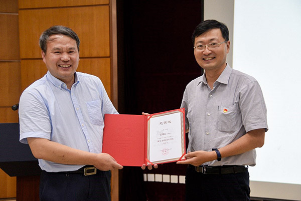 讲座结束后,密西根学院党委书记杨明为张现民赠送感谢状。感谢他通过详实的史料,为大家讲述很多鲜为人知的关于钱学森归国的历史事实。