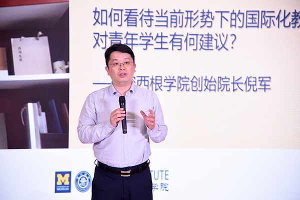 黄佩森在致辞中代表学院对2020级新生家长以及学生表示欢迎与感谢。他表示,在今年疫情带来很多不确定性的情况下,家长和新生们坚定地选择了密西根学院,是对密西根学院的信任和肯定。他回顾了密西根学院从建院开始到现在的快速发展和变化,在师资建设、国际合作、培养模式、科研发展、资源拓展等方面经历了从无到有、从单一到多元的突破,目前学院正在着力打造升级版密西根学院,为学生创造更多机会和资源。针对当前形势下的国际化教育以及青年学生该如何应对的问题,他引用创始院长倪军在最近一次分享活动中回答学生提问时的讲话:中国的国际化进程乃至全球的合作化趋势不可阻挡,虽然当前的形势暂时阻挡了同学们出国留学的脚步,但国际视野、国际合作的能力仍非常重要,同学们要坚定自己的信念和选择,锻炼自己的能力,为未来打好基础。