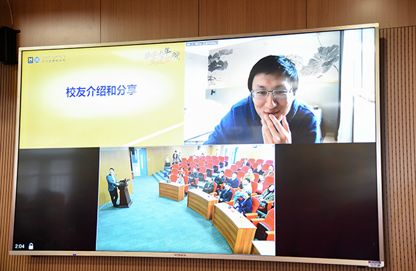 之后,线上和线下与会校友一一介绍和分享了毕业后的成长和发展。很多校友表示,学院在他们的人格养成、眼界开阔、能力提升等方面的培养至今仍影响深远,学院在发展过程中不断追求卓越的精神以及开拓创新的品质已经成为校友身上的烙印。如今,校友们已经在各行各业崭露头角,他们感谢学院培养的同时,也希望能尽自己所能回馈学院,助力母校为社会培养出更多更优秀的学生。