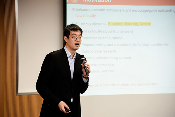 12月16日,上海交通大学密西根学院未来教授协会启动仪式及第一期主题交流活动在龙宾楼中集报告厅举行。学院研究生教育副院长孔令逊、教师韩充、马澄斌、李冕、但亚平、申岩峰、沈泳星、鲍华、杜长庆、王文东、钱炜慷、Nate Murray、陈松良等出席活动。此次由研究生教育委员会主办、研究生事务办公室承办的活动共吸引了120多位研究生、博士后在线上线下共同参与。