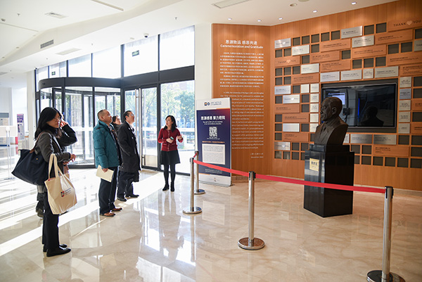 座谈会前,中国农业大学国际学院一行参观了密西根学院龙宾楼,听取了龙宾楼的设计、建设、使用和楼宇文化建设等方面的介绍。