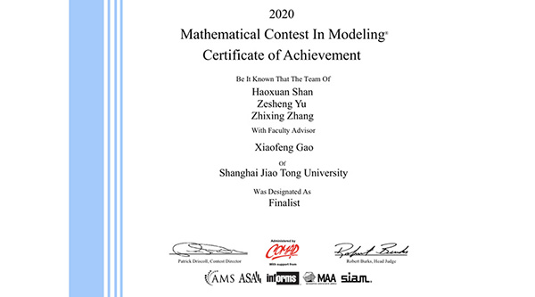 5月,2020年美国大学生数学建模竞赛成绩揭晓,由上海交通大学密西根学院学生组成或参与的多支队伍在与全球众多高校学子的竞争中脱颖而出,摘取多个奖项。 其中,1支队伍荣获特等奖提名奖(Finalist Winners),5支队伍荣获一等奖(Meritorious Winner),2支队伍荣获二等奖(Honorable Mention),2支队伍荣获三等奖(Successful Participant)。