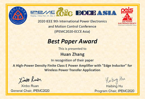 12月, 全球最大的专业技术组织IEEE(电气电子工程师学会)旗下的第九届国际电力电子与运动控制会议发布论文评选结果,上海交通大学密西根学院博士生张欢荣获最佳论文奖。张欢在会上汇报了他在兆赫兹无线电能传输技术的最新科研进展。基于论文《A High-Power Density Finite Class E Power Amplifier with “Edge Inductor” for Wireless Power Transfer Application》(无线电能传输系统中采用边缘电感设计的功率放大器的研究)的报告得到会议专家评审团的高度认可。评审团认为,论文立意新颖、论述清晰、结果良好,因而授予其最佳论文奖。