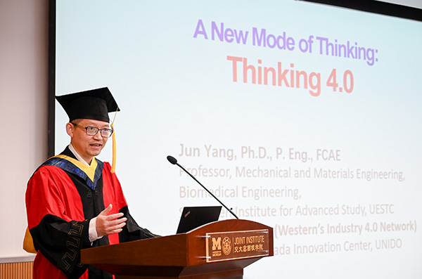 杨军以“A new thinking model:thinking 4.0”为题向全体毕业生作了精彩的主旨演讲。作为加拿大第一个工业4.0研发项目的中心主任,他结合自己的研究发现与同学们分享了对人类社会未来的深刻见解。他表示,在当今以信息物理系统、物联网等新技术为特点的工业4.0时代,知识正以前所未有的速度在快速增长。面对信息爆炸所带来的挑战,同学们应该采用全新的思维模式,去做一个深邃的思考者。
