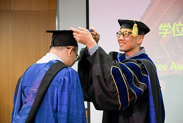 随后,全体毕业生依次走上主席台,由院领导、导师为他们授予学位、绶带拨穗,并合影留念。