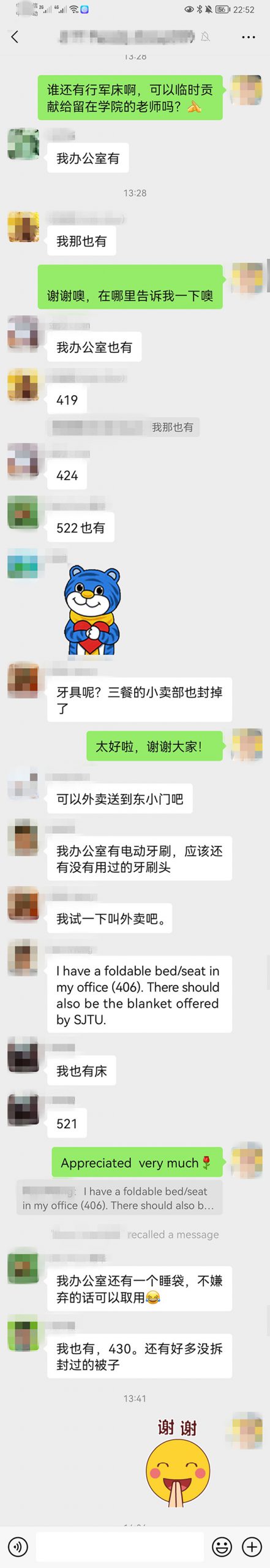 面对疫情管控的挑战,全体师生立即行动起来,群策群力,迅速筹集到洗漱用品、被子、食品等物资,投入到各项抗疫工作中。学院的教职工工作群里,老师们纷纷表示可以征用自己折叠床和生活用品,以解决留校人员的过夜问题。学院的学生工作群里,同学们纷纷报名加入校园志愿者的队伍,为防疫工作出一份绵薄之力。