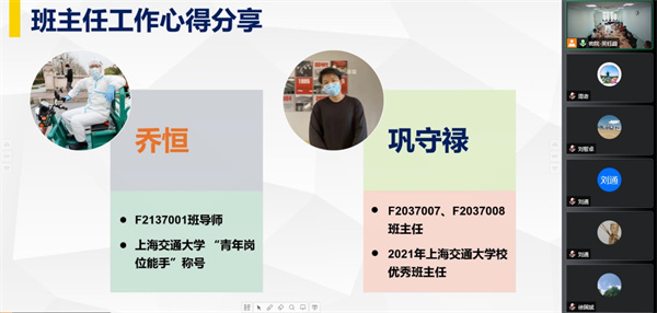 班主任代表助理教授乔恒和研究生巩守禄进行了工作交流。巩守禄从提前规划、把握角色定位、寻求互助三个方面分享了自己作为班主任的心路历程。乔恒就前期对班级同学进行的作息调研,向与会老师汇报调研结果并讨论解决思路。