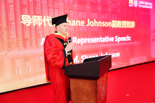 密西根学院副教授Shane Johnson作为导师代表发言。他在祝贺毕业生顺利毕业的同时,分享了几点自己总结出来的人才培养的步骤和经验。他表示保持正直、追求卓越和不断创新是取得成功的基础,希望同学们努力为自己和团队制定科学合理的愿景,在关键时刻获得或给予支持,循序渐进,坚持不懈,不断精进长处、补齐短处,不断激励自己迈向更加光明的未来。