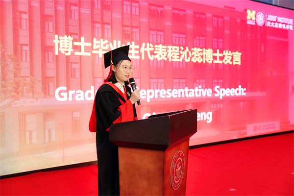 程沁蕊代表博士毕业生发言。她首先对学院及教职员工表示衷心感谢。回忆自己的博士生涯,她对选择跨专业就读博士学位而面临的巨大压力和读博过程中导师黄佩森教授的悉心指导仍记忆犹新。她十分感谢跨学科背景在她求职和未来发展过程中提供的宝贵财富。她相信经历过疫情冲击和伴随而来的生活和求职压力的这届毕业生,在应对未来不确定性和挑战时也能更加成熟。