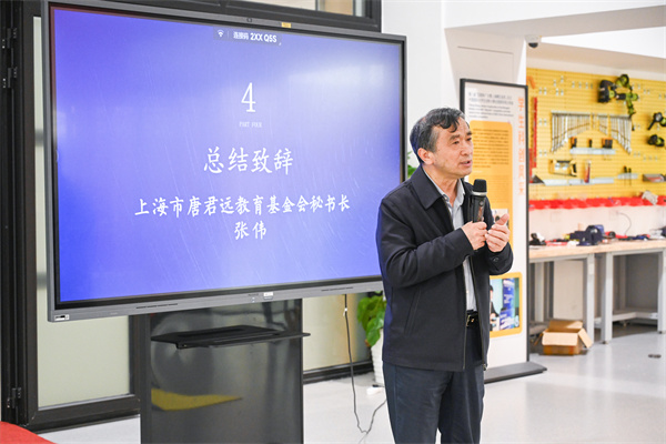 张伟作大赛总结致辞。张伟肯定了学院对于唐君远学生创新创业中心的建设,赞扬了“黎明杯”对于新生创新思维与实践能力方面的重要作用。他结合决赛的所见所感,寄语同学们持续在大学阶段尝试、磨砺、突破。张伟表示,上海市唐君远教育基金会将继续支持学生成长发展,也期待在日后见证更多的学生创新活动。