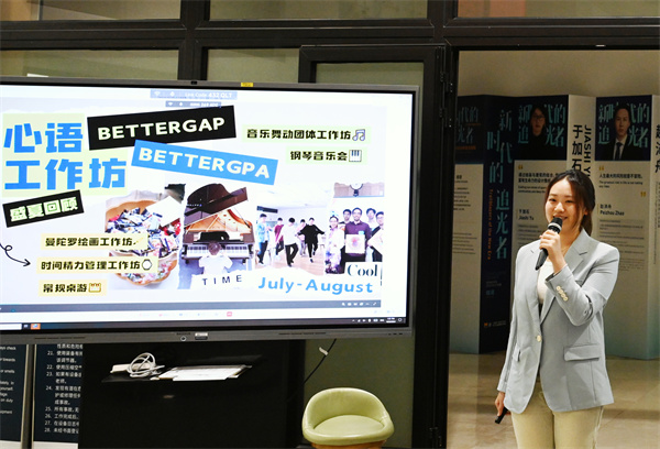 23级心理委员、心语工作坊核心成员徐天夷代表团队,对夏季学期工作进行了回顾。她通过精心制作的PPT,轻松活泼的语言风格,娓娓道来,带领大家回顾了心语工作坊在夏季学期举办的各项活动,并展示了来自同学与老师们的积极反馈。