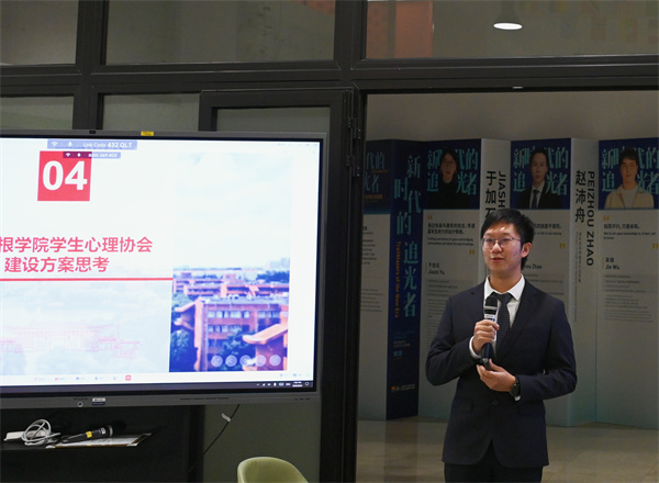 心语工作坊核心成员王远方代表团队,从学院心理健康工作已有基础、组织架构、未来展望三方面详细阐述了学院自春季学期起开始酝酿、筹建密院学生心理协会的工作思考。他代表工作团队,对未来学生心理协会组织定位、部门设置、工作职责等方面汇报了工作设想,同时也呼吁与会同学们积极出谋献策,参与到相关工作中来。为更好地在密西根学院营造积极、轻松的氛围,做出自己的一份贡献!