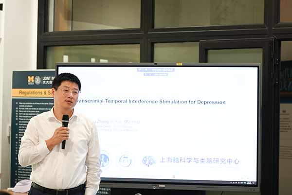 张陈诚以“无创脑机接口技术在抑郁症治疗领域的应用”一题进行了专题学术报告。他从抑郁症发病机理与发病特征,讲到当下药物治疗的局限性,并对无创脑电刺激(TIS)进行了深入浅出的介绍,对无创脑电刺激的应用场景进行了展望。张陈诚表示,脑科学是一门与诸多学科交叉学科,他非常希望并鼓励密西根学院同学们积极参与到工科与医学、脑科学、精神病学交叉领域研究中来,在这样一个心理疾病越来越高发的数字时代,为人类健康尽一份力。