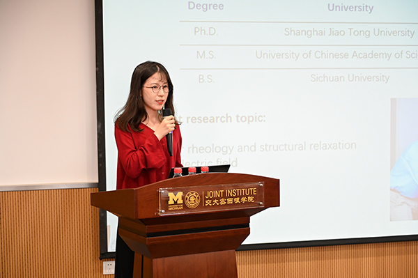 JI postdoc Xinyan Zhao, doctoral students Miao Huo and Han Wei played roles of jobseekers on stage who were interviewed by a panel of three JI associate professors including Mian Li, Wenjie Wan and Hua Bao. The interviews were hosted by Associate Professor Chong Han.