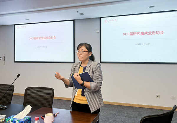 周奇首先介绍了往届研究生毕业去向。她通过详实的数据向同学们着重分析了毕业之后的就业去向选择和当前就业形势,并就毕业手续及相关政策等方面重点强调了毕业生推荐表、毕业去向登记、上海户口申请、报到证、档案等毕业事务的注意事项与相关政策要求。周奇表示,希望同学们利用好学校学院就业资源,及时关注学校学院就业网、微信平台等各类就业信息,明确就业意向,抓住就业机会。她鼓励大家与祖国同向同行,将目光放长远。
