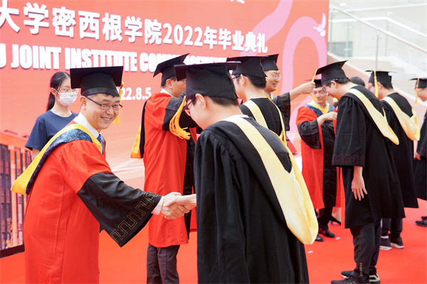 The 2022 University of Michigan-Shanghai Jiao Tong University Joint Institute (UM-SJTU JI,JI hereafter) Commencement Ceremony was held at Long Bin Building of the SJTU campus on August 5. The event was also held simultaneously online for students and their relatives who were not able to be attend in-person.